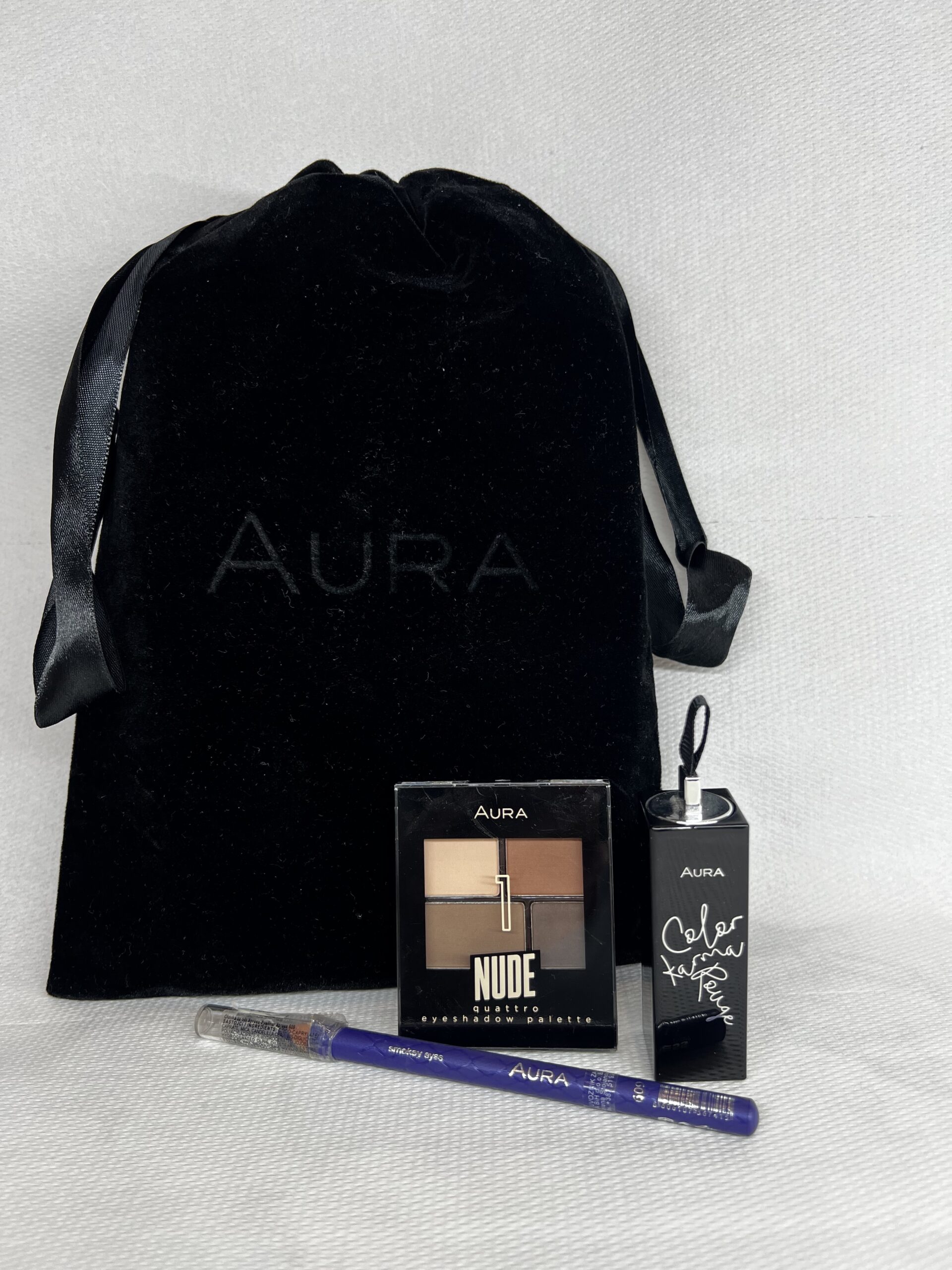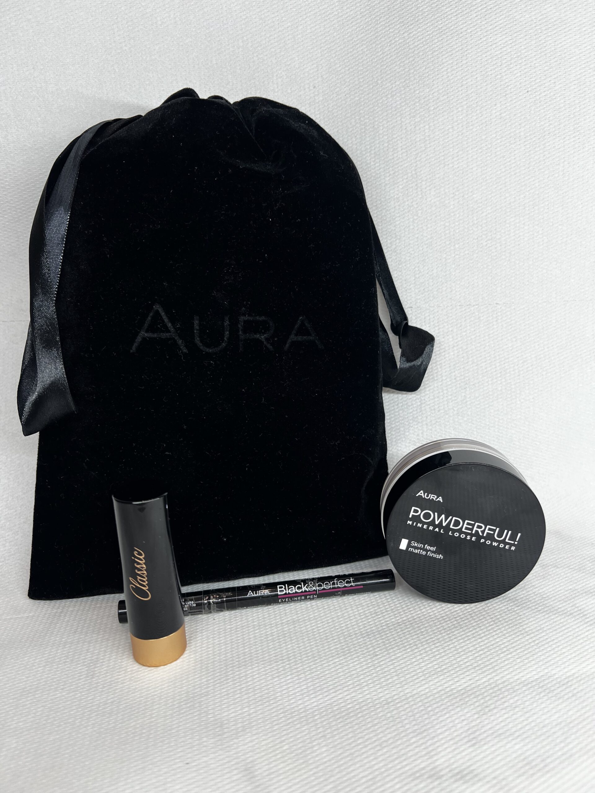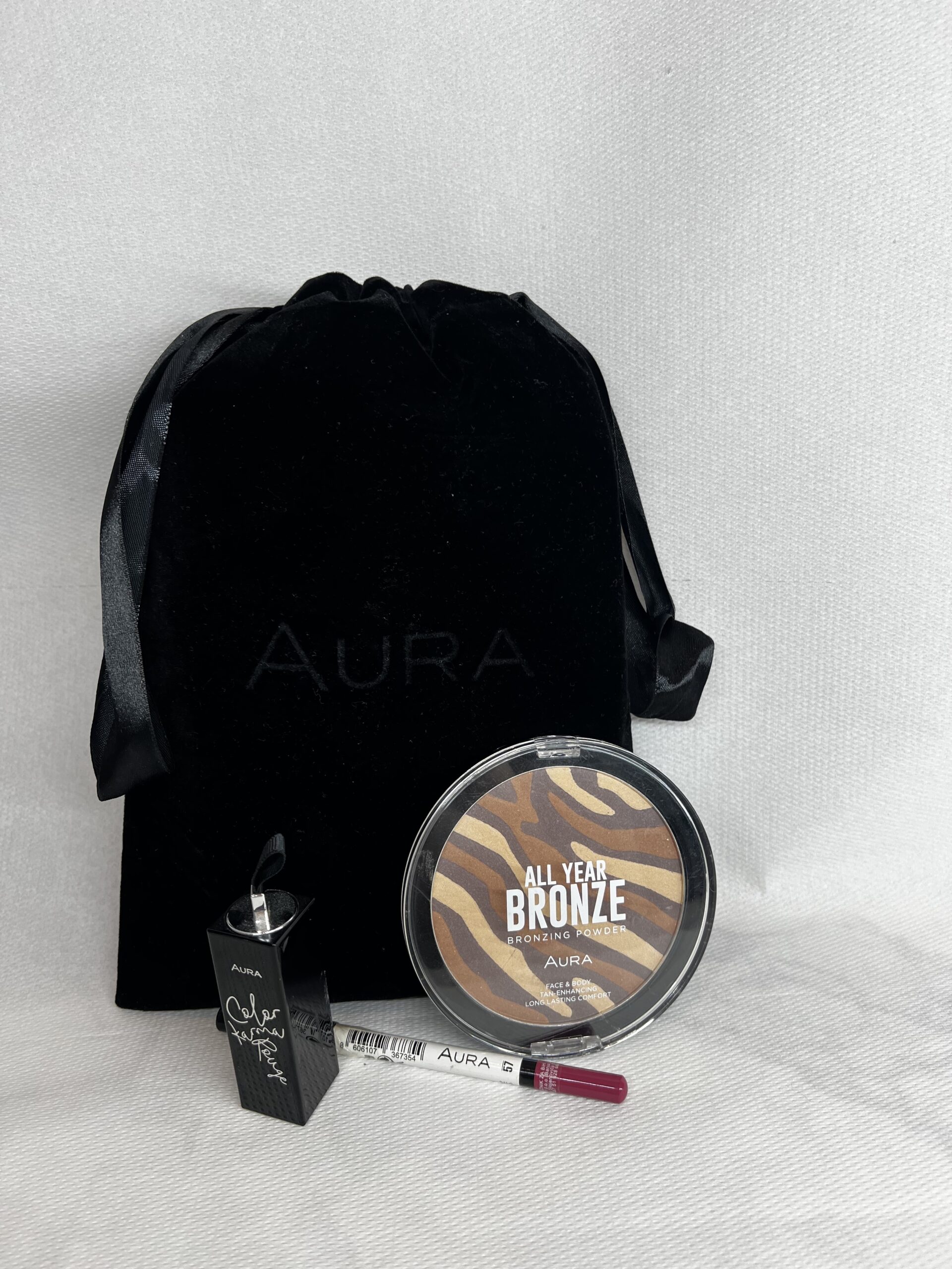 Aura Beauty Bag Set je pažljivo formiran poklon set koji sadrži tri AURA make-up proizvoda upakovana u crnu plišanu torbicu sa satenskom trakom.